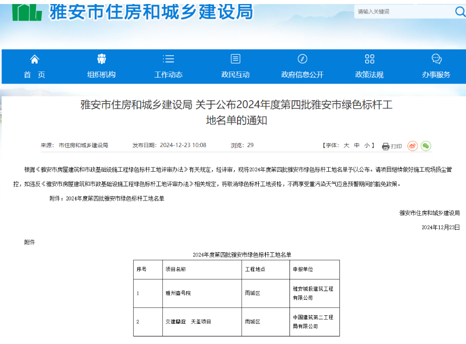 12月23日,雅安市住房和城鄉(xiāng)建設(shè)局發(fā)布了《關(guān)于公布2024年度四批雅安市綠色標桿工地名單的通知》,雅安交建集團蘭庭•天璽項目,以卓越的綠色實踐榮獲“雅安市綠色標桿工地”殊榮。