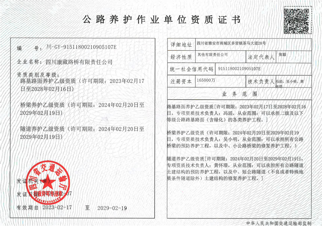 近日,雅安市交通建設(shè)(集團)有限責任公司通過自主申報,成功通過四川省交通運輸廳公路養(yǎng)護作業(yè)單位資質(zhì)評審,完成公路養(yǎng)護作業(yè)單位資質(zhì)增項,新增橋梁養(yǎng)護乙級、隧道養(yǎng)護乙級兩項資質(zhì)。