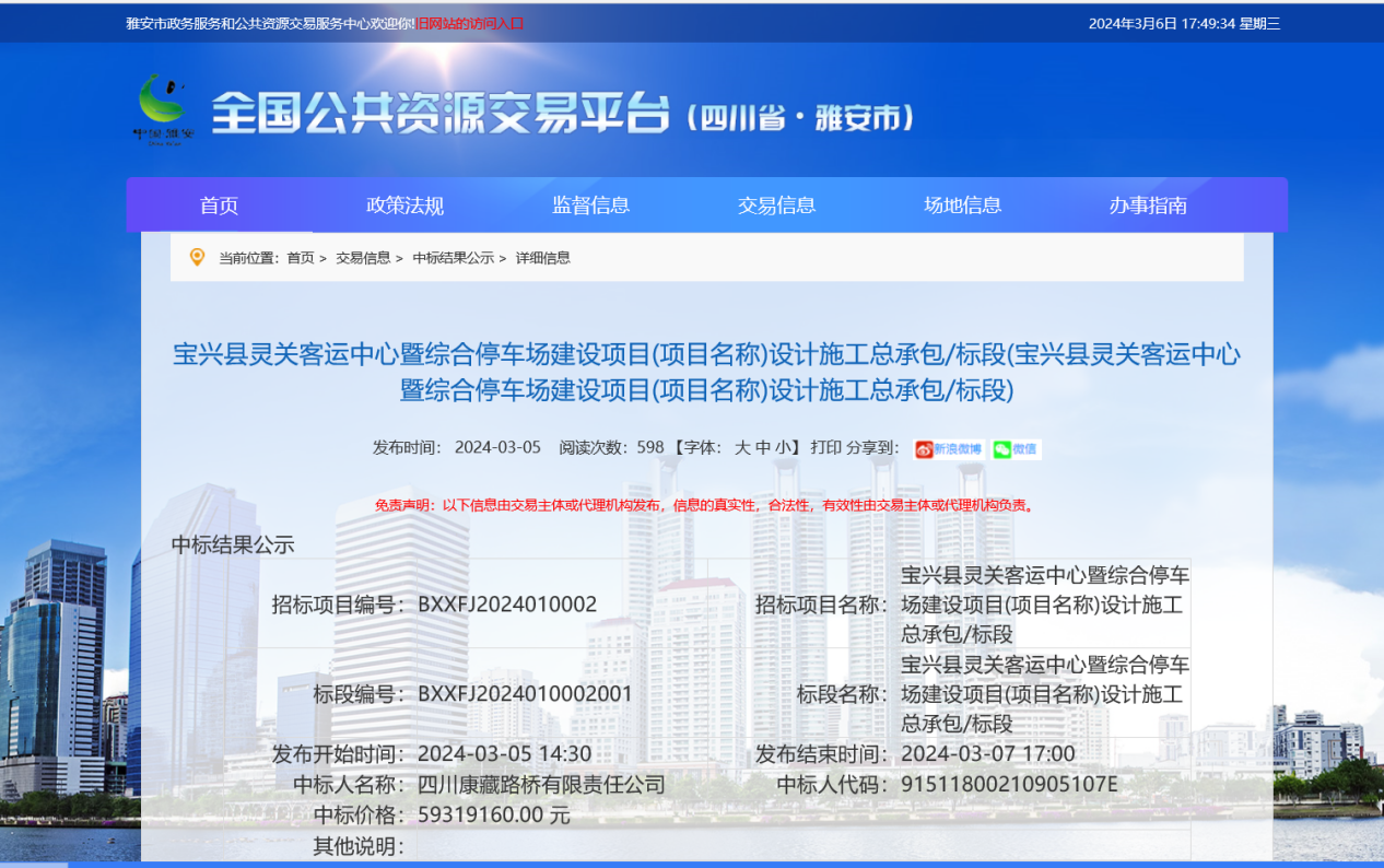 日前,雅安交建集團康藏路橋公司中標寶興縣靈關(guān)客運中心暨綜合停車場建設(shè)項目,取得2024市場開發(fā)“開門紅”。