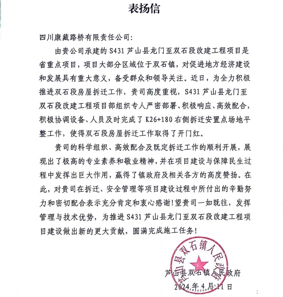 近日,雅安交建集團(tuán)四川康藏路橋有限責(zé)任公司收到來自蘆山縣雙石鎮(zhèn)人民政府的表揚(yáng)信。信中對(duì)S431蘆山縣龍門至雙石段改建工程項(xiàng)目部積極協(xié)調(diào)設(shè)備、人員配合當(dāng)?shù)卣瓿蒏26+180右側(cè)拆遷安置點(diǎn)場地平整工作,使得雙石段房屋拆遷工作取得了開門紅給予了高度評(píng)價(jià)和贊揚(yáng)。