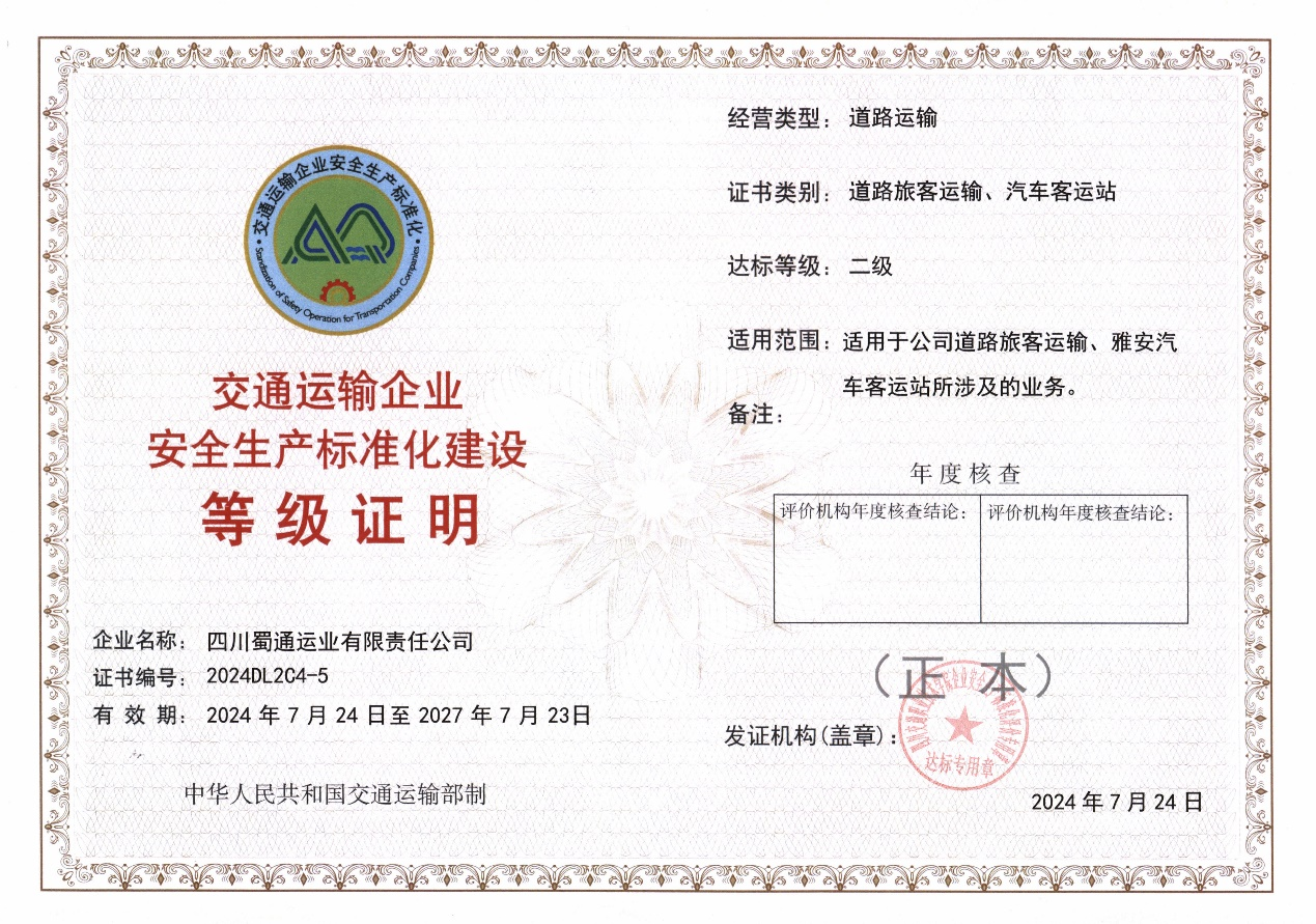 近日,經四川省交通運輸企業(yè)安全生產標準化評價機構綜合評定,雅安交建集團蜀通公司順利通過安全標準化二級企業(yè)驗收并獲得等級證書,標志著公司安全管理工作更趨于標準化,安全管理水平邁上了新臺階。