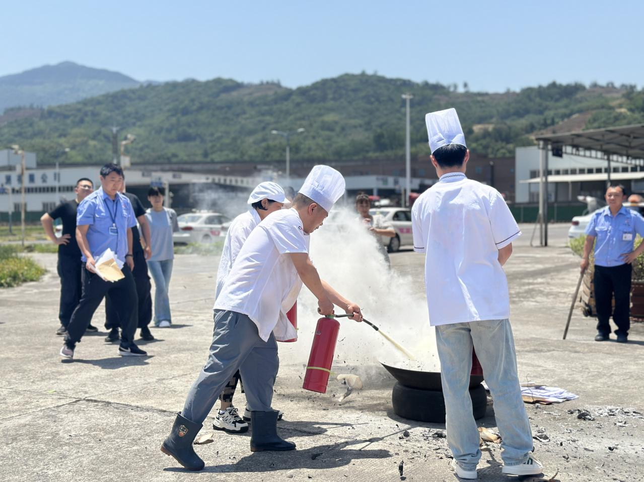 正式演練前,公司副總經(jīng)理鄭循禮講述了“防災減災日”的由來,傳授了防震避難、防火防電、防洪防汛等方面的基本知識,專業(yè)人員對消防器材使用方式進行了教學,并組織廚師、安全部重點人員模擬起火現(xiàn)場,“零距離”體驗消防護具。隨后,開展地震應急演練,在模擬地震的預警信號發(fā)出后,全體職工運用學習的避震知識,雙手抱頭、蜷縮身體、降低重心,快速有序撤離室內到達戶外安全區(qū)域。