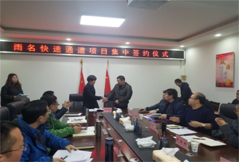 1月23日,雨名快速通道項目集中簽約儀式在雅安交建集團四樓會議室舉行。雅安市交建集團、四川省公路工程監(jiān)理事務所、四川瑞通工程建設集團有限公司、山東黃河工程集團有限公司將共同攜手,加快建設雨名快速通道,加速我市三區(qū)同城化發(fā)展步伐,共同打造品質(zhì)工程。