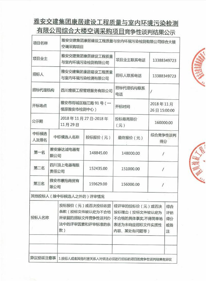 綜合大樓空調采購項目競爭性談判結果公示