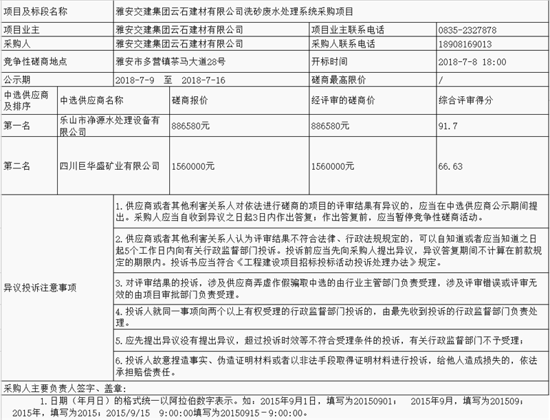 雅安交建集團(tuán)云石建材有限公司洗砂廢水處理系統(tǒng)采購(gòu)項(xiàng)目中選供應(yīng)商公示