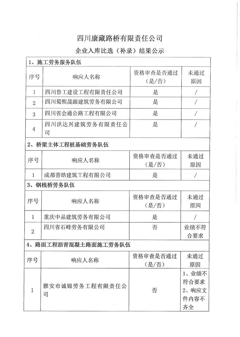 四川康藏路橋有限責(zé)任公司企業(yè)入庫比選(補錄)結(jié)果公示
