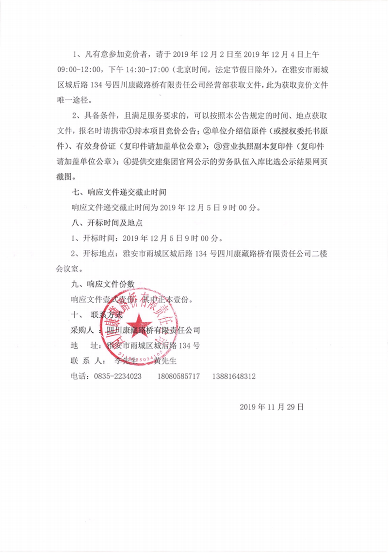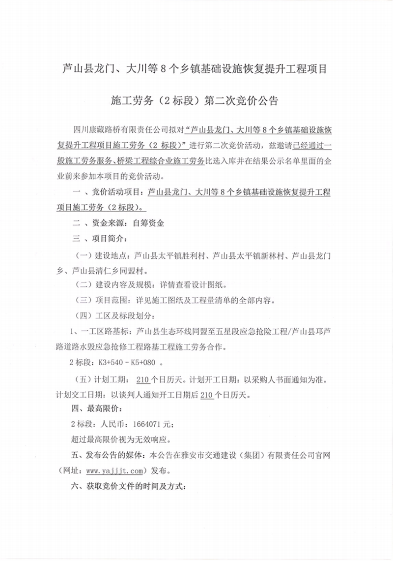 四川康藏路橋有限責(zé)任公司蘆山縣龍門(mén)、大川等8個(gè)鄉(xiāng)鎮(zhèn)基礎(chǔ)設(shè)施恢復(fù)提升工程項(xiàng)目施工勞務(wù)(2標(biāo)段)第二次競(jìng)價(jià)公告