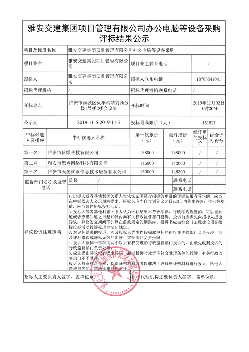 雅安交建集團(tuán)項(xiàng)目管理有限公司辦公電腦等設(shè)備采購評標(biāo)結(jié)果公示