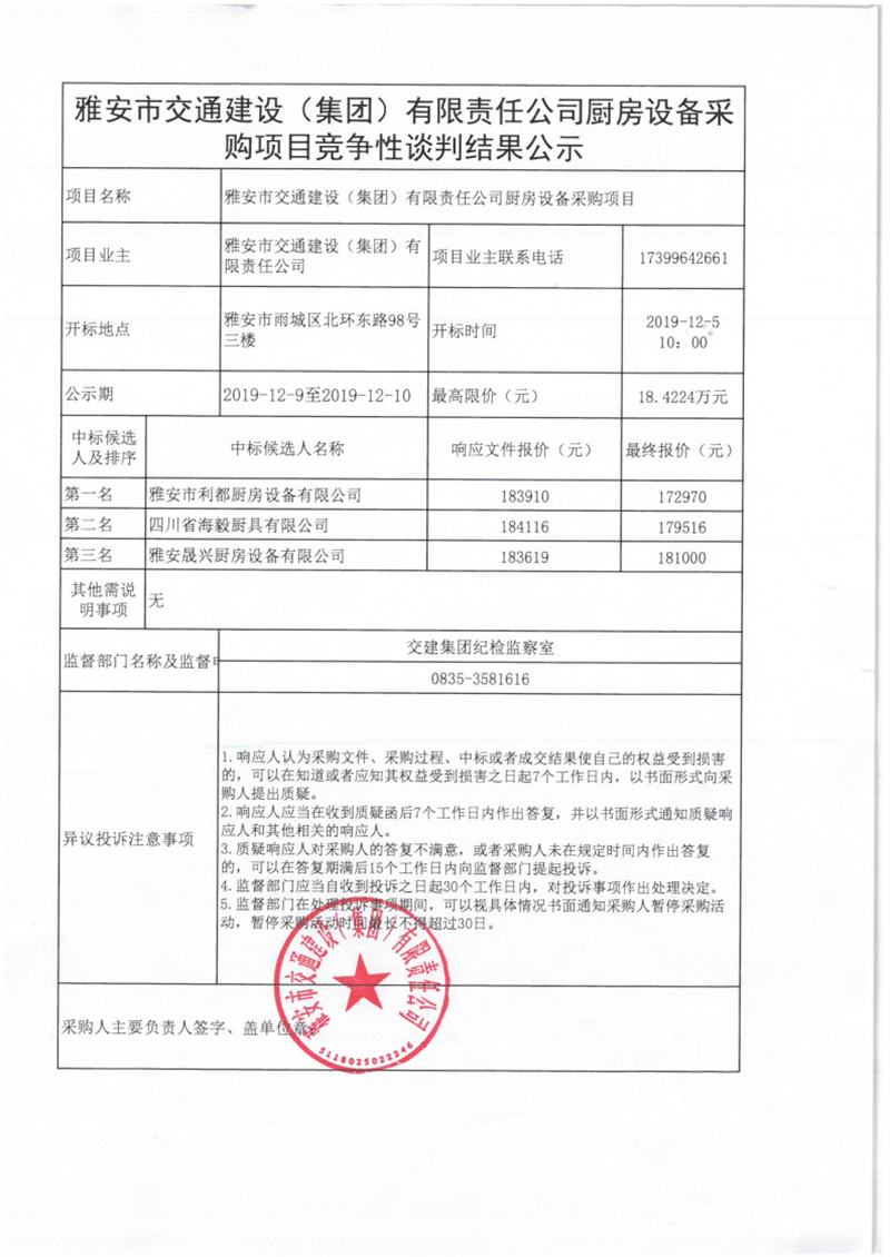 雅安市交通建設(shè)(集團)有限責任公司廚房設(shè)備采購項目競爭性談判結(jié)果公示