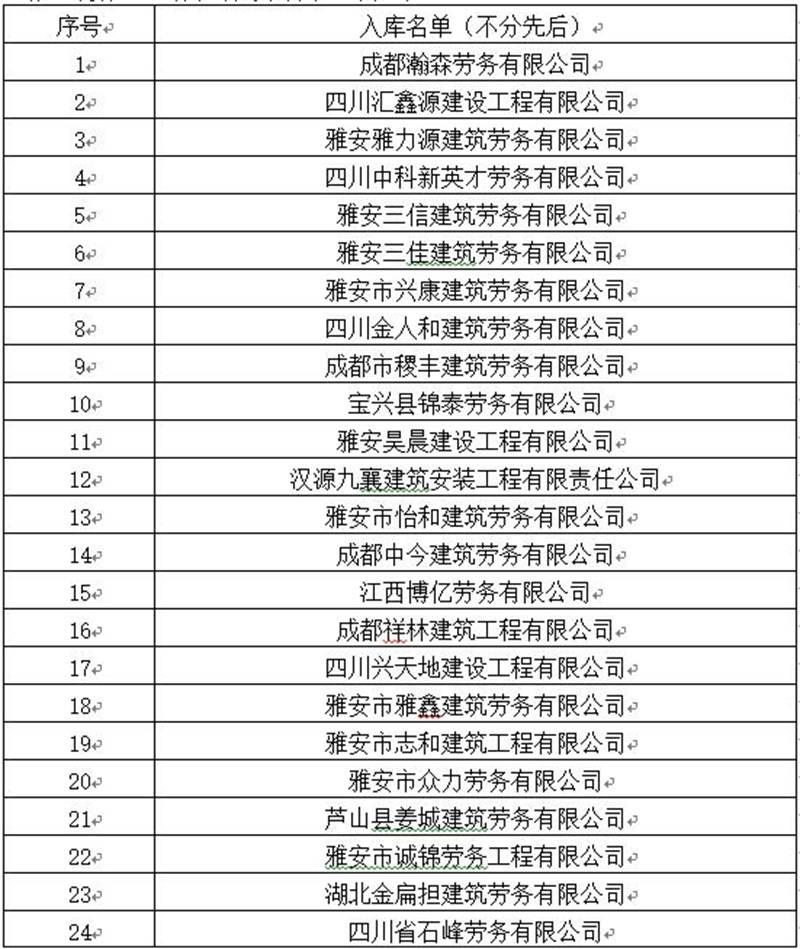 雅安交建集團(tuán)路橋有限責(zé)任公司勞務(wù)服務(wù)入庫(kù)比選項(xiàng)目于2019年5月11日完成開(kāi)評(píng)標(biāo)工作,現(xiàn)將比選結(jié)果即入庫(kù)名單公示如下:
