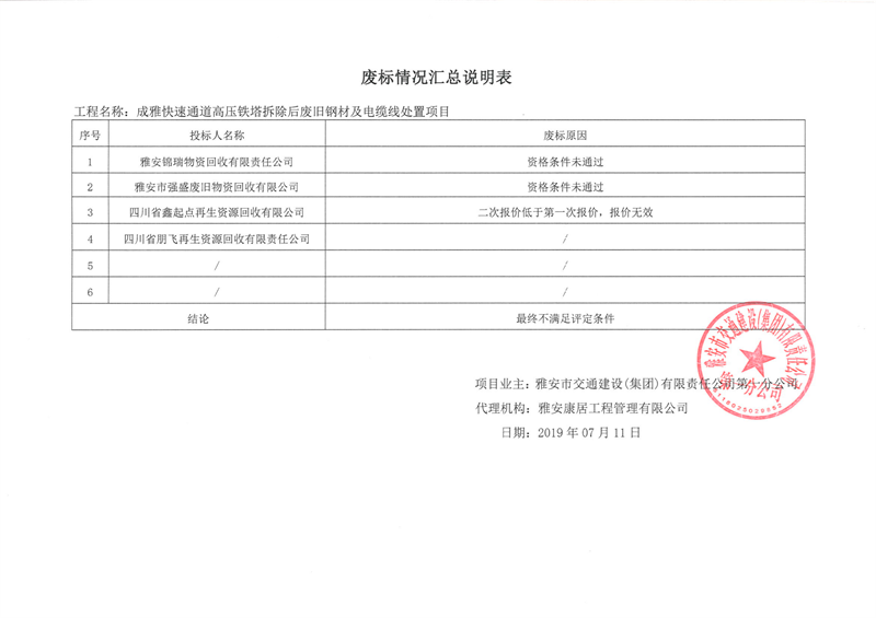 雅安市交通建設(shè)(集團)有限責任公司第一分公司成雅快速通道高壓鐵塔拆除后廢舊鋼材及電纜線處置項目廢標情況匯總說明表