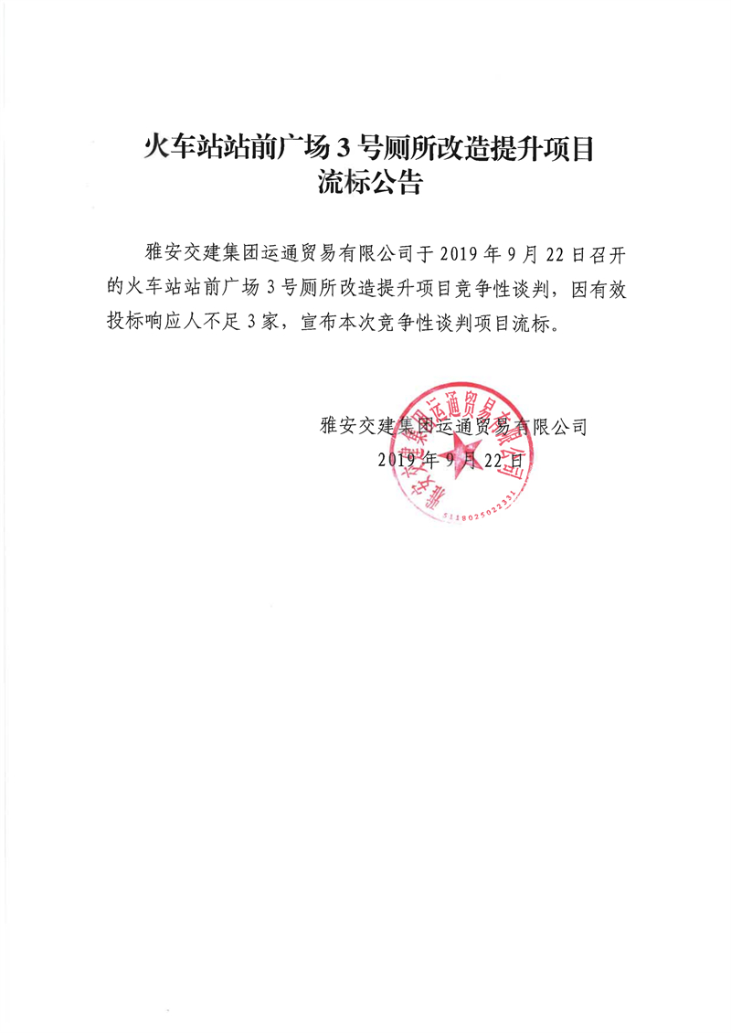 雅安交建集團(tuán)運(yùn)通貿(mào)易有限公司火車站站前廣場3號廁所改造提升項目流標(biāo)公告