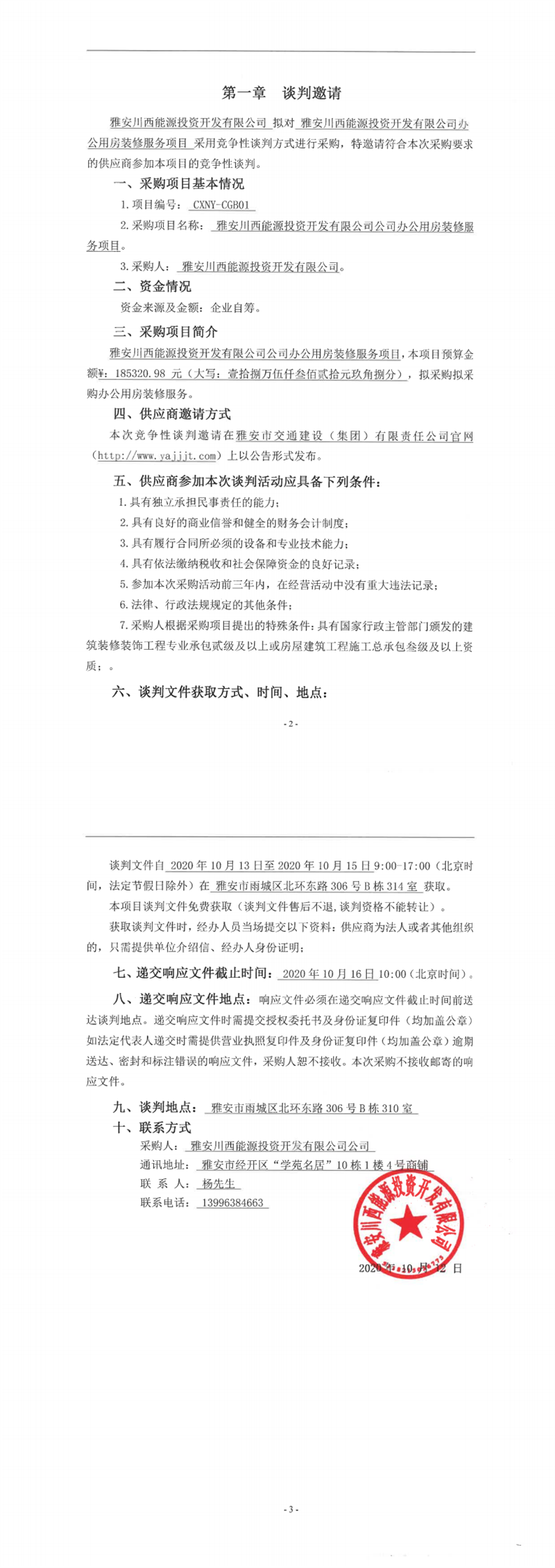 雅安川西能源投資開發(fā)有限公司辦公用房裝修服務(wù)項目競爭性談判公告