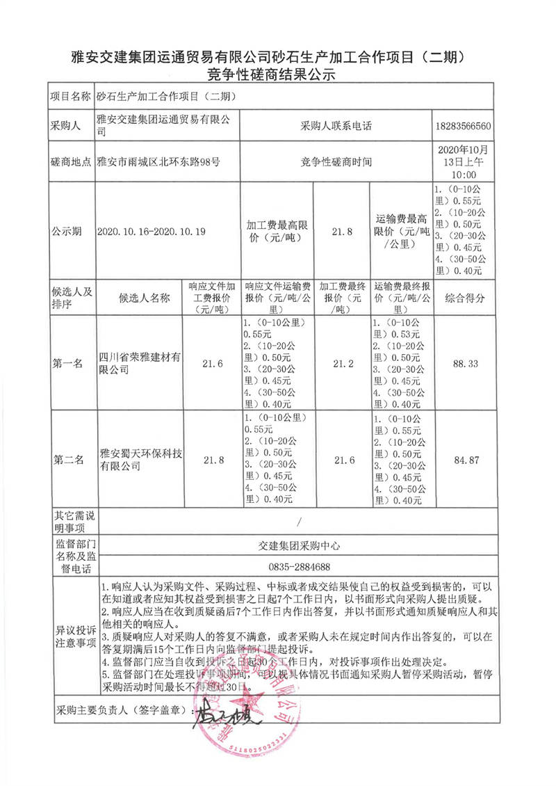 雅安交建集團(tuán)運(yùn)通貿(mào)易有限公司砂石生產(chǎn)加工合作項(xiàng)目(二期)競(jìng)爭(zhēng)性磋商結(jié)果公示