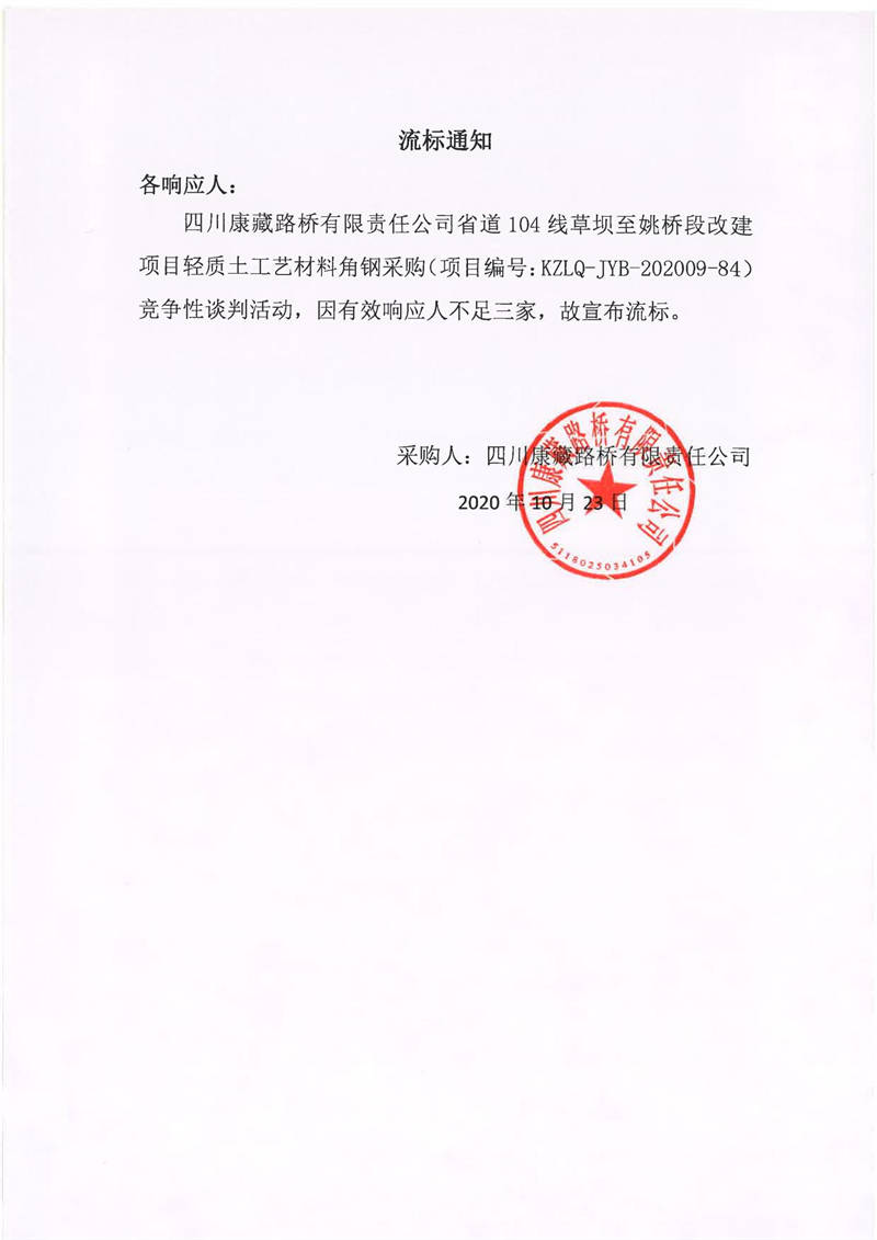 四川康藏路橋有限責(zé)任公司省道104線草壩至姚橋段改建項(xiàng)目輕質(zhì)土工藝材角鋼采購(gòu)項(xiàng)目流標(biāo)通知