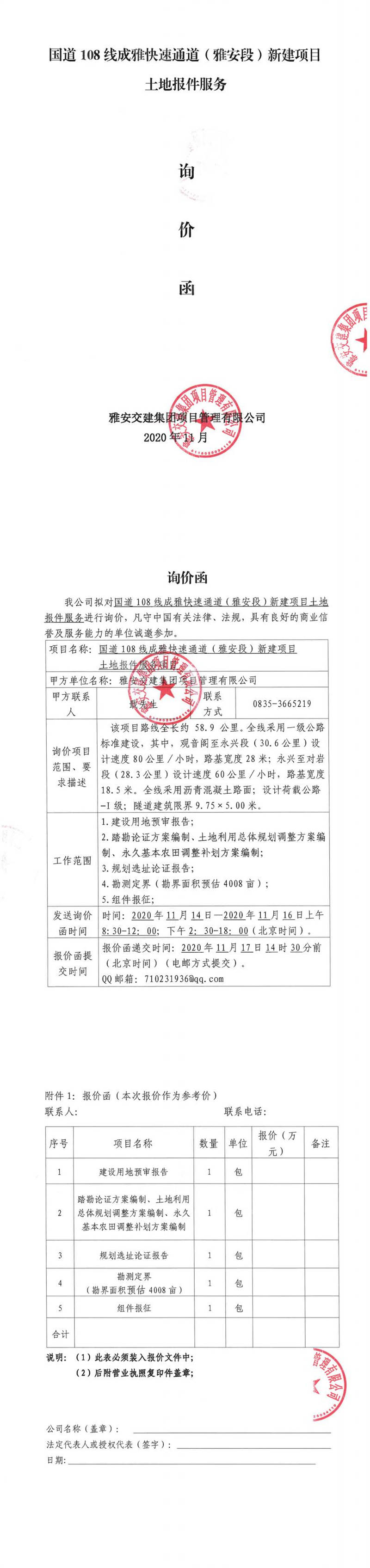 雅安交建集團(tuán)項(xiàng)目管理有限公司國(guó)道108線成雅快速通道(雅安段)新建項(xiàng)目土地報(bào)件服務(wù)項(xiàng)目詢(xún)價(jià)函