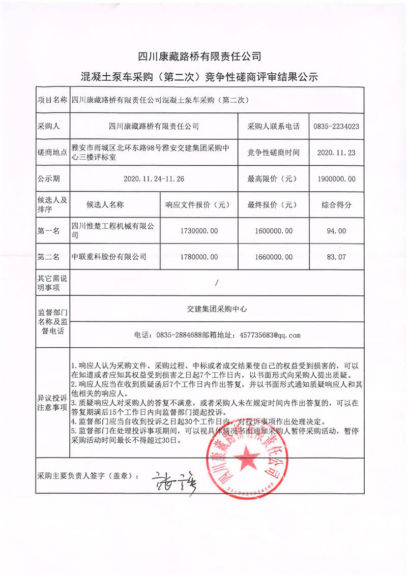 四川康藏路橋有限責(zé)任公司混凝土泵車采購(gòu)(第二次)競(jìng)爭(zhēng)性磋商評(píng)審結(jié)果公示