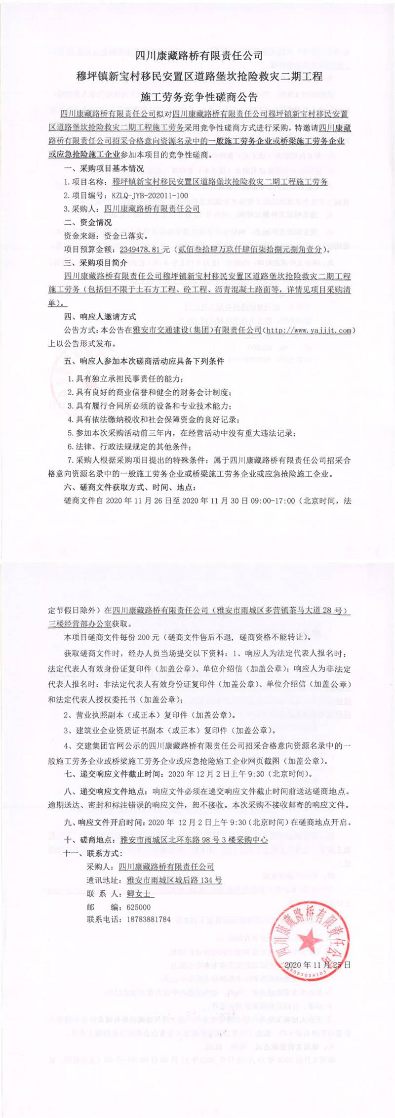 四川康藏路橋有限責(zé)任公司穆坪鎮(zhèn)新寶村移民安置區(qū)道路堡坎搶險(xiǎn)救災(zāi)二期工程施工勞務(wù)競爭性磋商公告