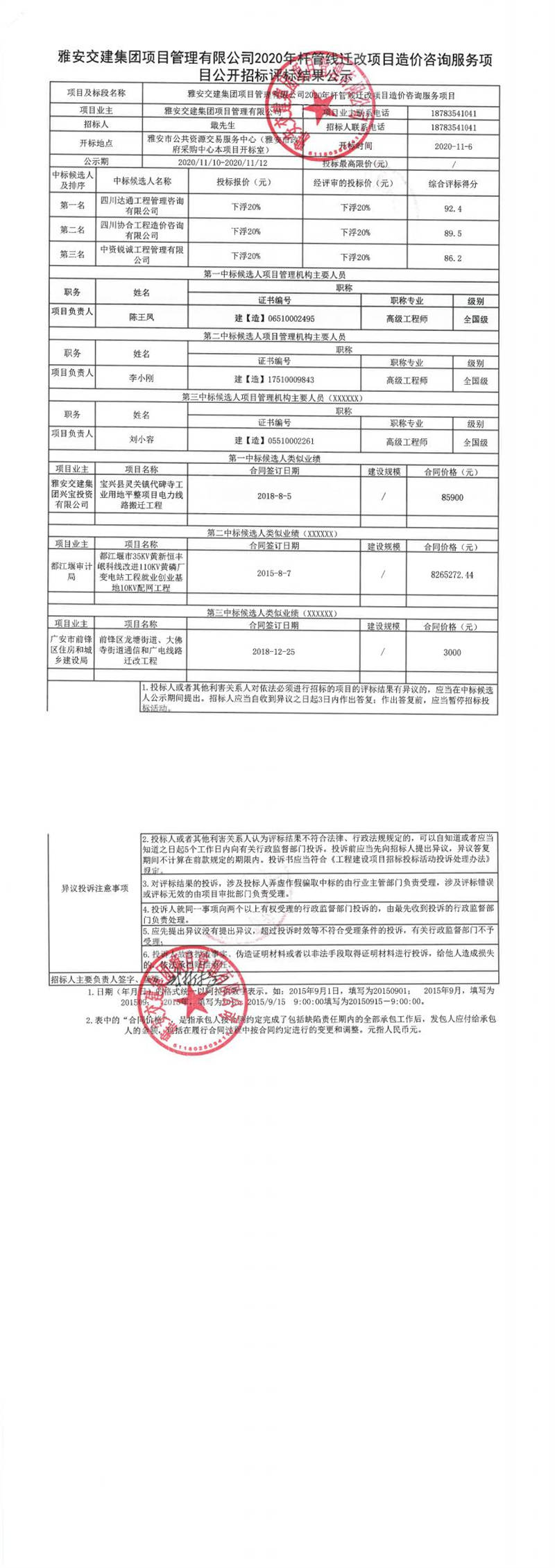 雅安交建集團(tuán)項(xiàng)目管理有限公司2020年桿管線遷改項(xiàng)目造價(jià)咨詢服務(wù)項(xiàng)目公開(kāi)招標(biāo)評(píng)標(biāo)結(jié)果公示