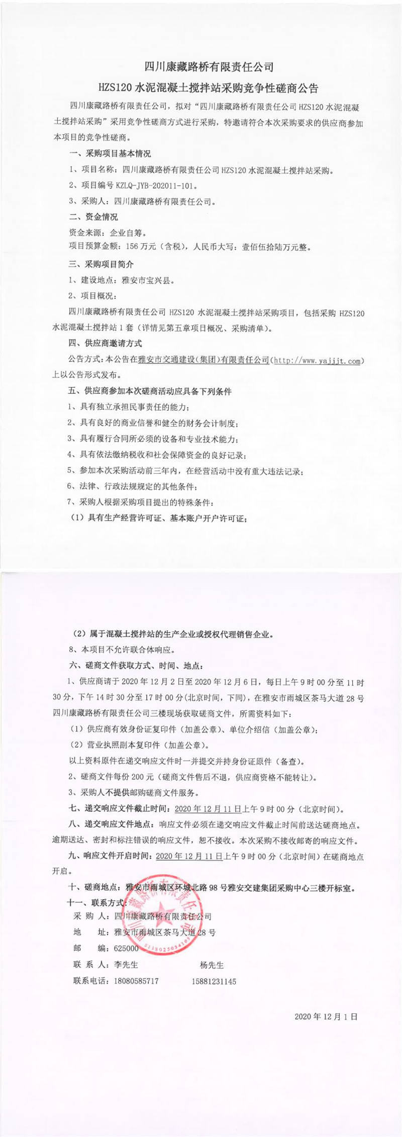 四川康藏路橋有限責(zé)任公司HZS120水泥混凝土攪拌站采購(gòu)競(jìng)爭(zhēng)性磋商公告