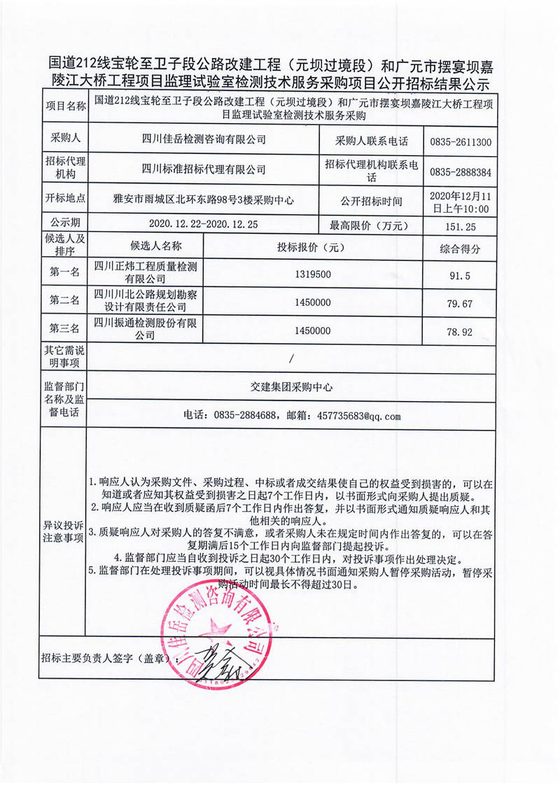 四川佳岳檢測咨詢有限公司國道212線寶輪至衛(wèi)子段公路改建工程(元壩過境段)和廣元市擺宴壩嘉陵江大橋工程項目監(jiān)理試驗室檢測技術(shù)服務(wù)采購項目公開招標(biāo)結(jié)果公示