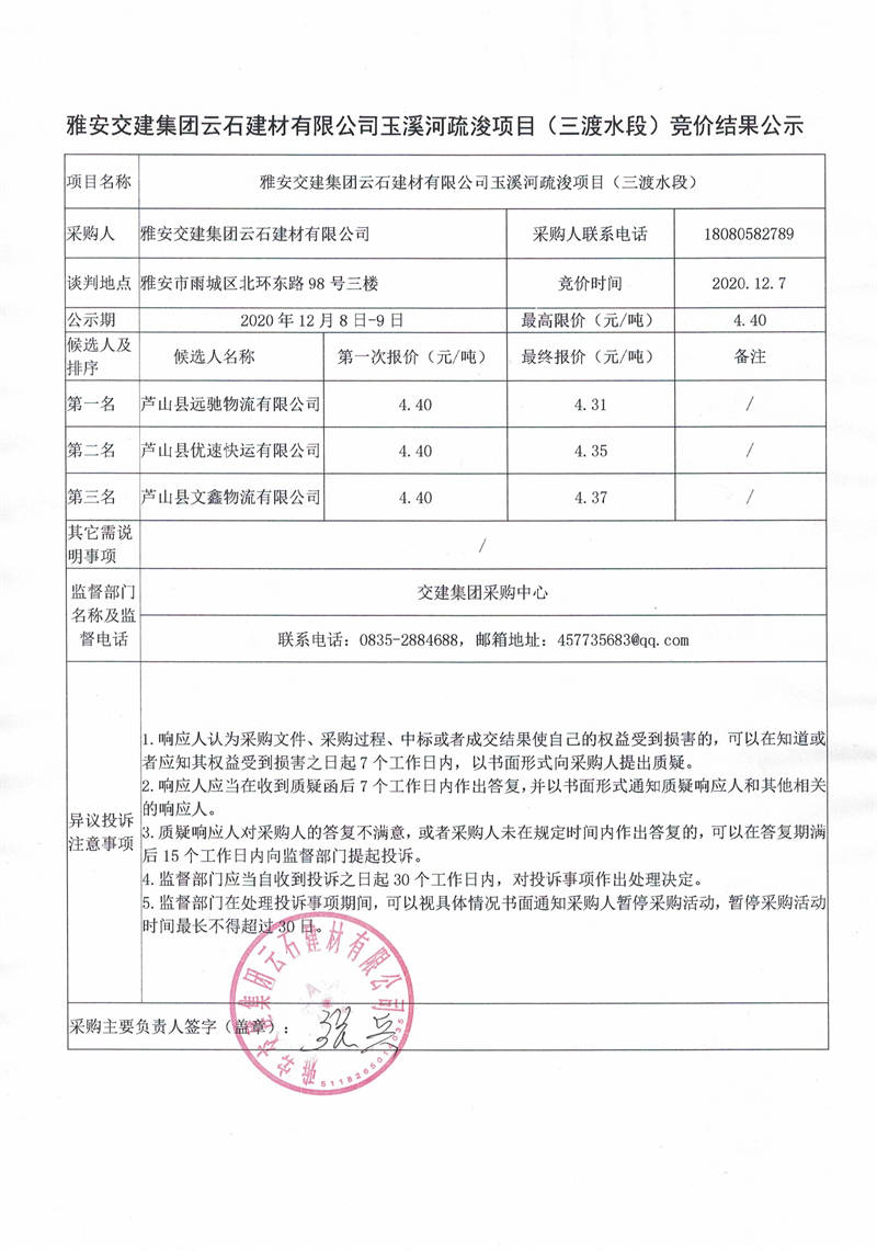 雅安交建集團(tuán)云石建材有限公司玉溪河疏浚項(xiàng)目(三渡水段)競(jìng)價(jià)結(jié)果公示