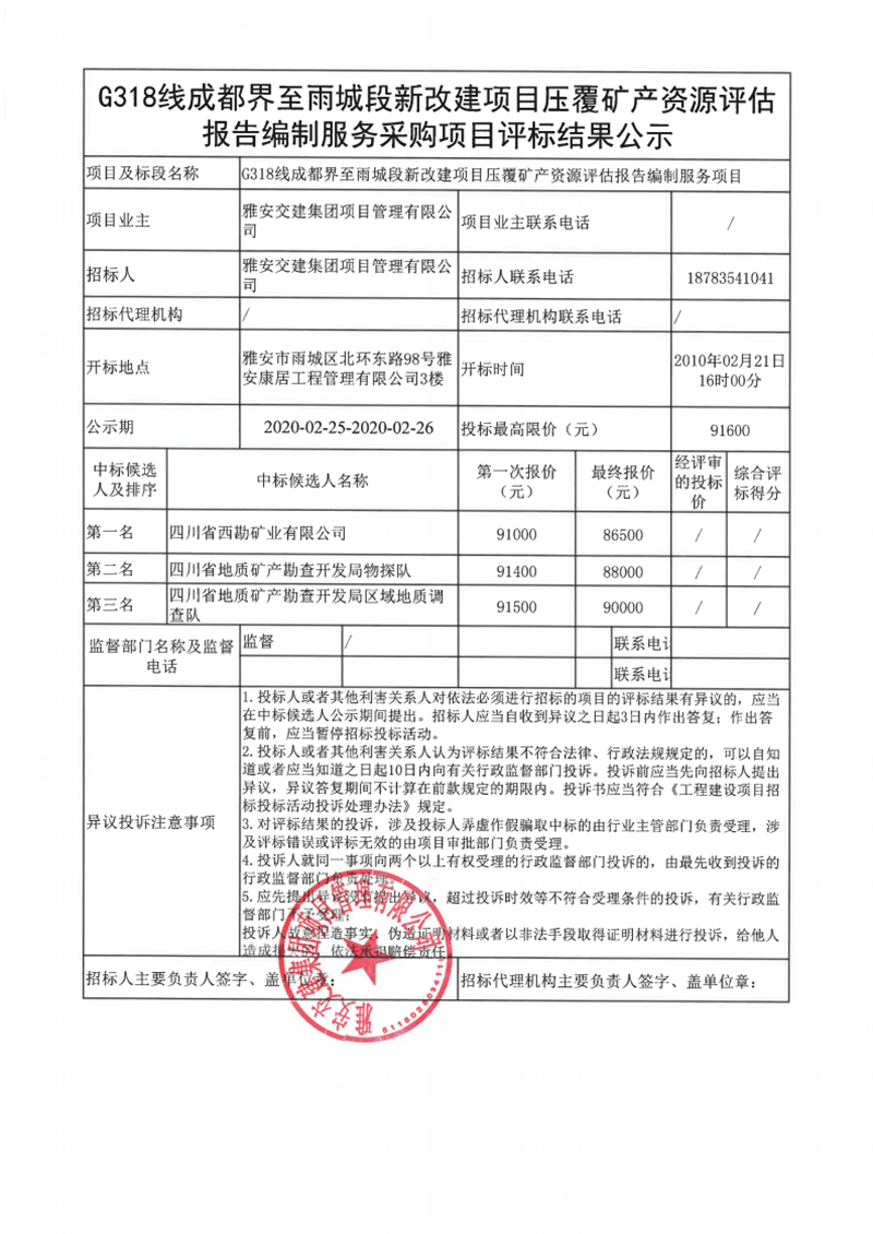 雅安交建集團項目管理有限公司G318線成都界至雨城段新改建項目壓覆礦產(chǎn)資源評估報告編制服務采購項目評標結(jié)果公示