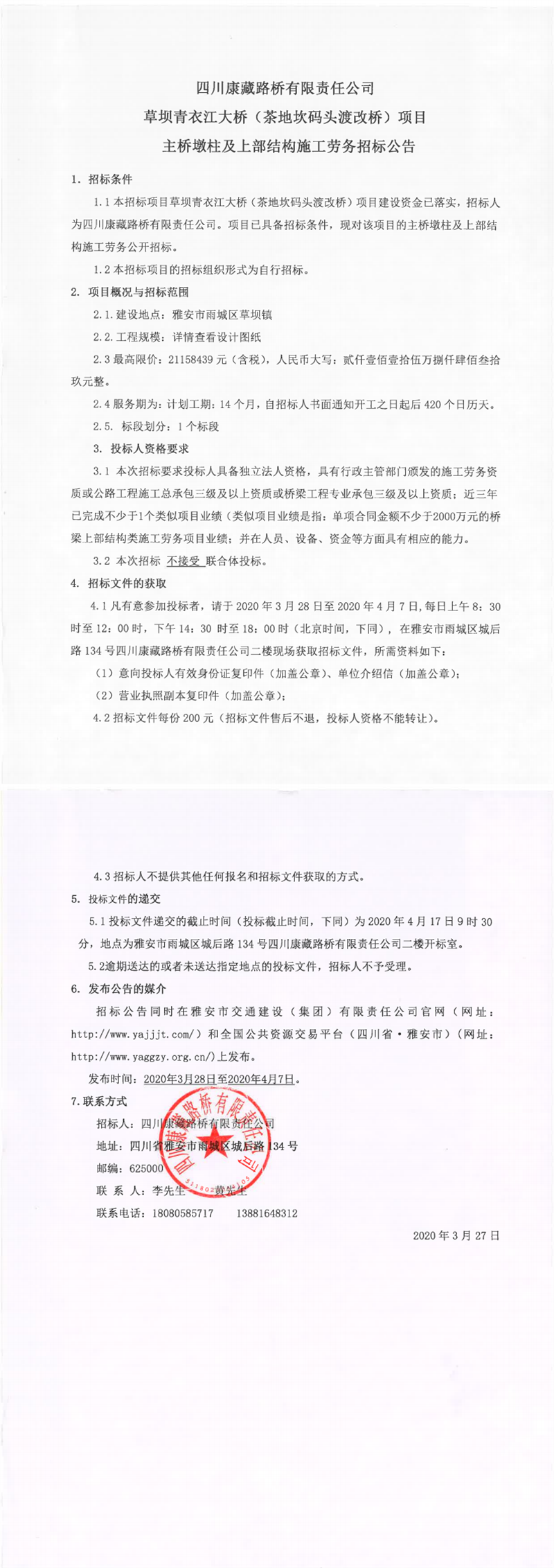四川康藏路橋有限責(zé)任公司草壩青衣江大橋(茶地坎碼頭渡改橋)項(xiàng)目主橋墩柱及上部結(jié)構(gòu)施工勞務(wù)招標(biāo)公告