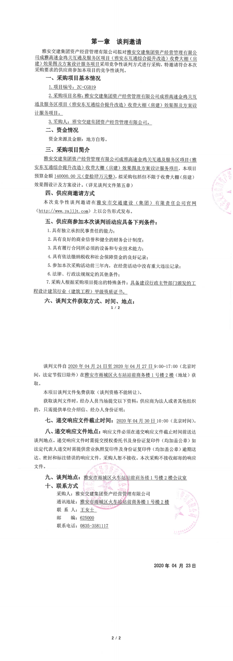 雅安交建集團資產(chǎn)經(jīng)營管理有限公司成雅高速金雞關(guān)互通及服務(wù)區(qū)項目(雅安東互通綜合提升改造)收費大棚(房建)效果圖及方案設(shè)計服務(wù)項目競爭性談判公告