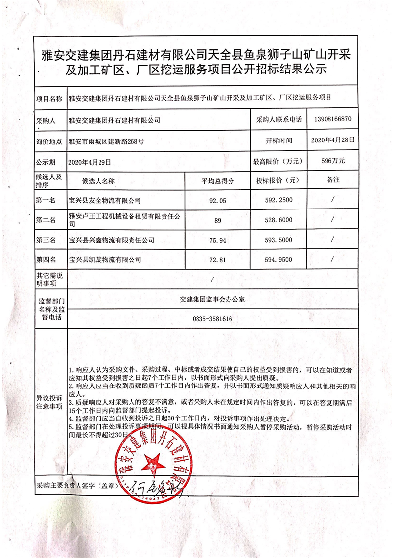 雅安交建集團(tuán)丹石建材有限公司天全縣魚泉獅子山礦山開采及加工礦區(qū)、廠區(qū)挖運(yùn)服務(wù)項目公開招標(biāo)結(jié)果公示