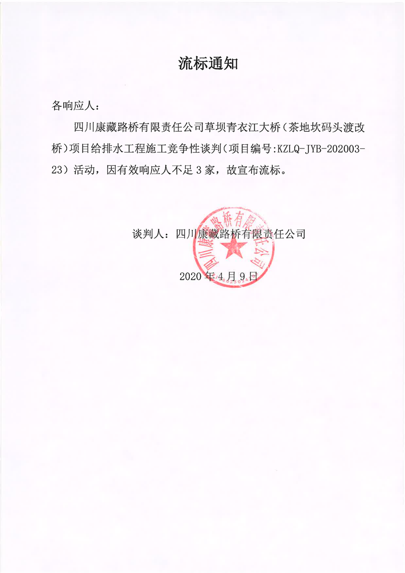 四川康藏路橋有限責任公司草壩青衣江大橋(茶地坎碼頭渡改橋)項目給排水工程施工競爭性談判流標通知