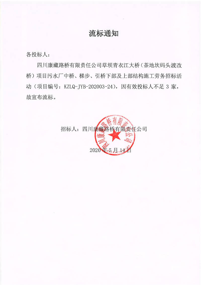 四川康藏路橋有限責任公司草壩青衣江大橋(茶地坎碼頭渡改橋)項目污水廠中橋、梯步、引橋下部及上部結(jié)構(gòu)施工勞務(wù)流標通知