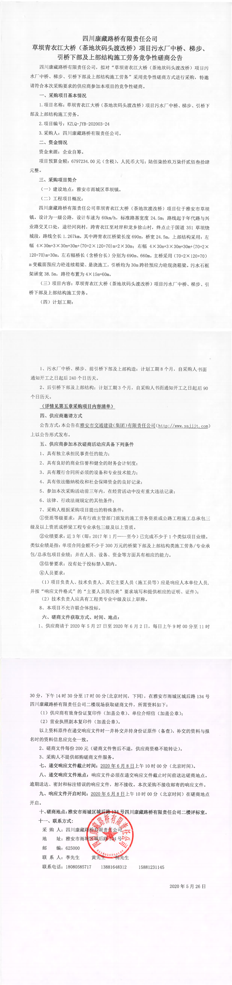 四川康藏路橋有限責任公司草壩青衣江大橋(茶地坎碼頭渡改橋)項目污水廠中橋、梯步、引橋下部及上部結(jié)構(gòu)施工勞務(wù)競爭性磋商公告