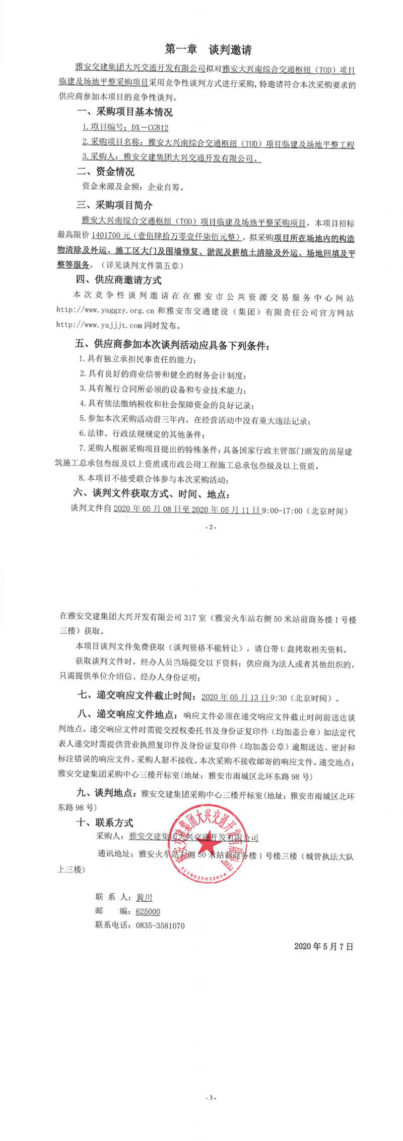 雅安交建集團(tuán)大興交通開發(fā)有限公司雅安大興南綜合交通樞紐(TOD)項(xiàng)目臨建及場(chǎng)地平整工程競(jìng)爭(zhēng)性談判公告