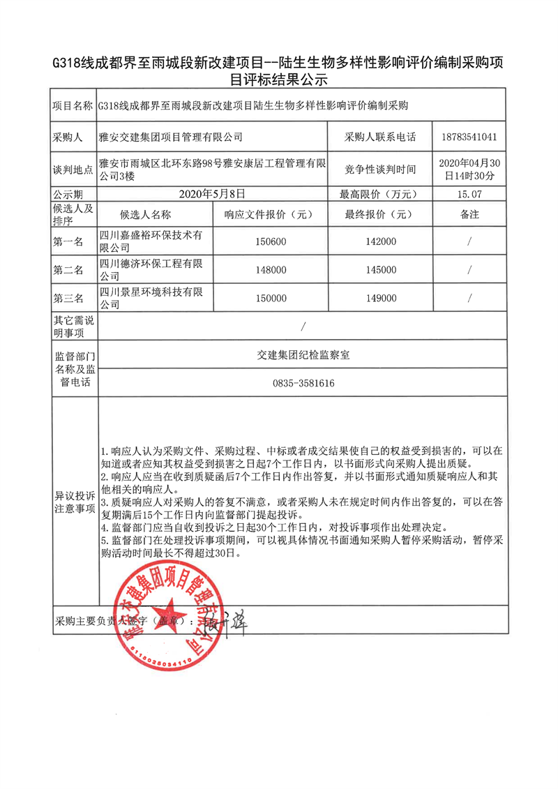 雅安交建集團項目管理有限公司G318線成都界至雨城段新改建項目陸生生物多樣性影響評價編制采購項目評標結果公示