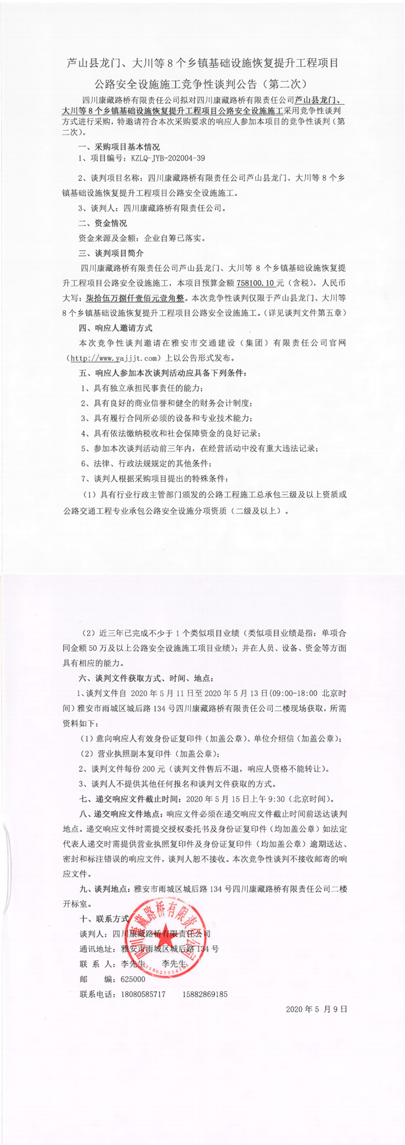 四川康藏路橋有限責(zé)任公司蘆山縣龍門(mén)、大川等8個(gè)鄉(xiāng)鎮(zhèn)基礎(chǔ)設(shè)施恢復(fù)提升工程項(xiàng)目公路安全設(shè)施施工競(jìng)爭(zhēng)性談判公告(第二次)