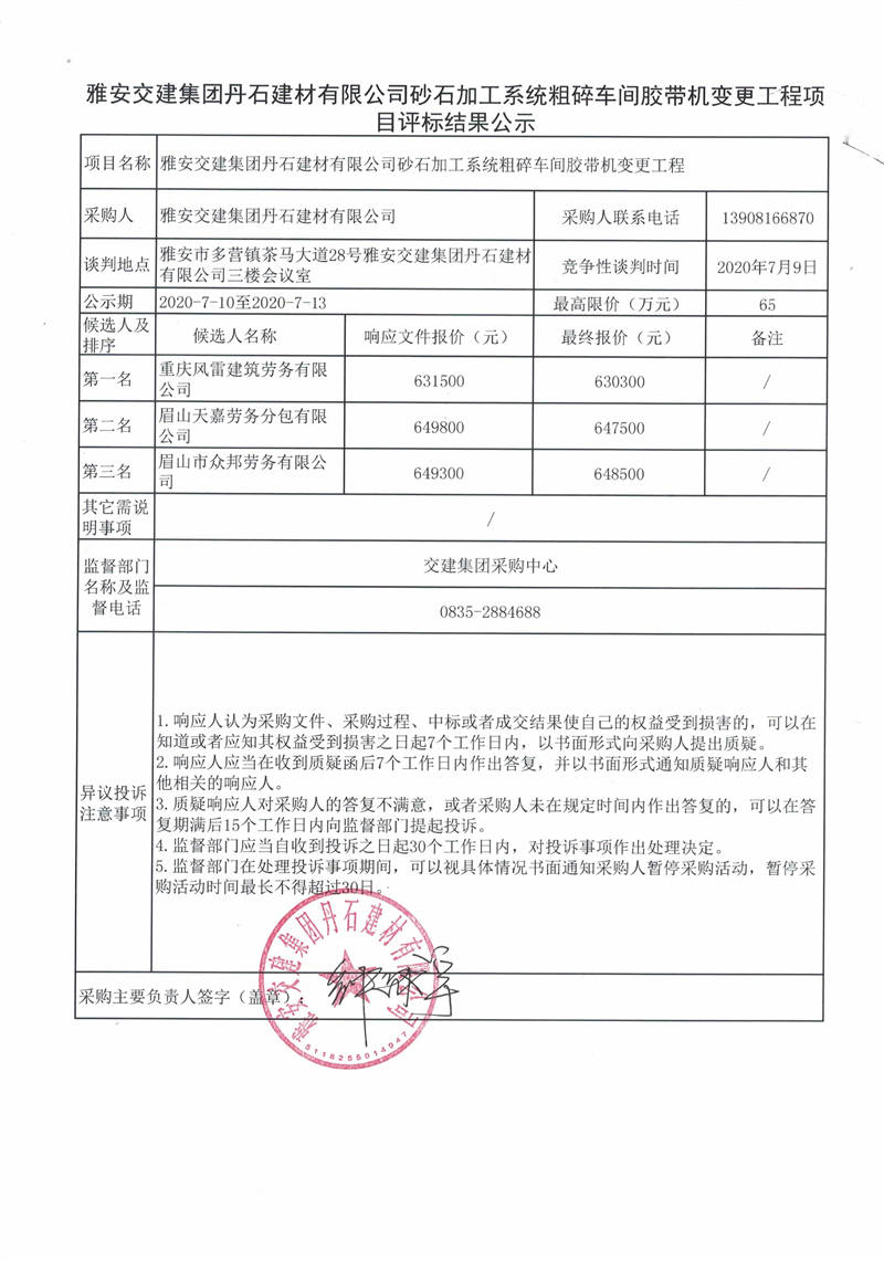 雅安交建集團丹石建材有限公司砂石加工系統(tǒng)粗碎車間膠帶機變更工程項目評標結果公示