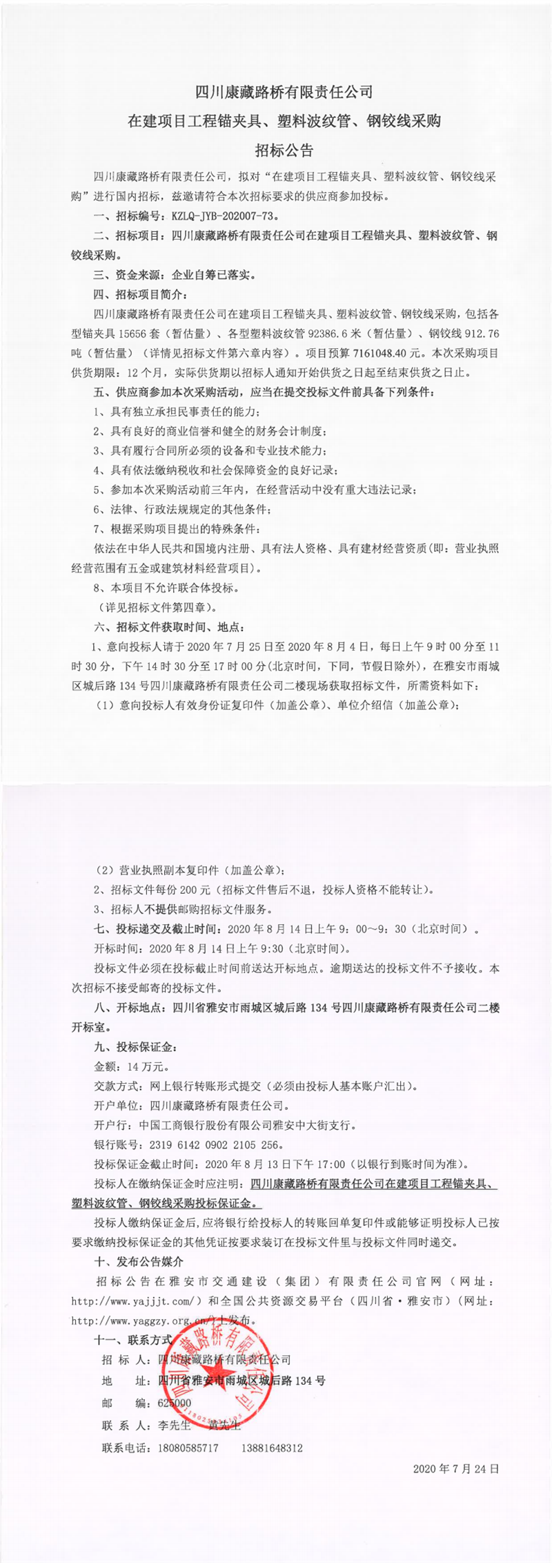 四川康藏路橋有限責(zé)任公司在建項(xiàng)目工程錨夾具、塑料波紋管、鋼鉸線采購(gòu)招標(biāo)公告