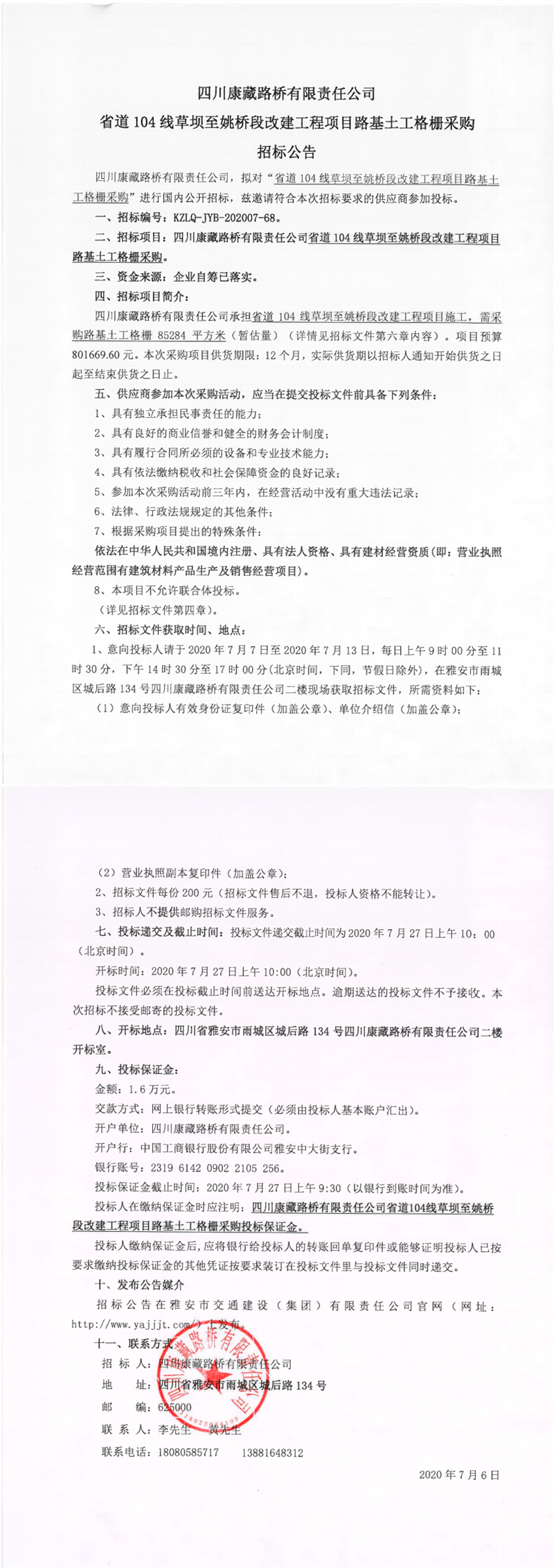 四川康藏路橋有限責(zé)任公司省道104線草壩至姚橋段改建工程項目路基土工格柵采購招標公告