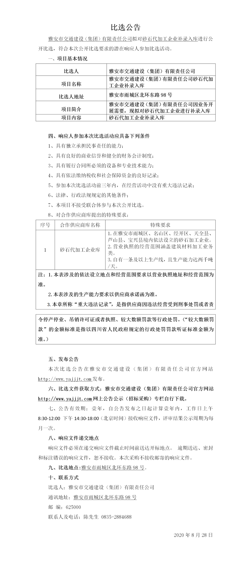 雅安市交通建設(shè)(集團)有限責(zé)任公司砂石代加工企業(yè)補錄入庫比選公告