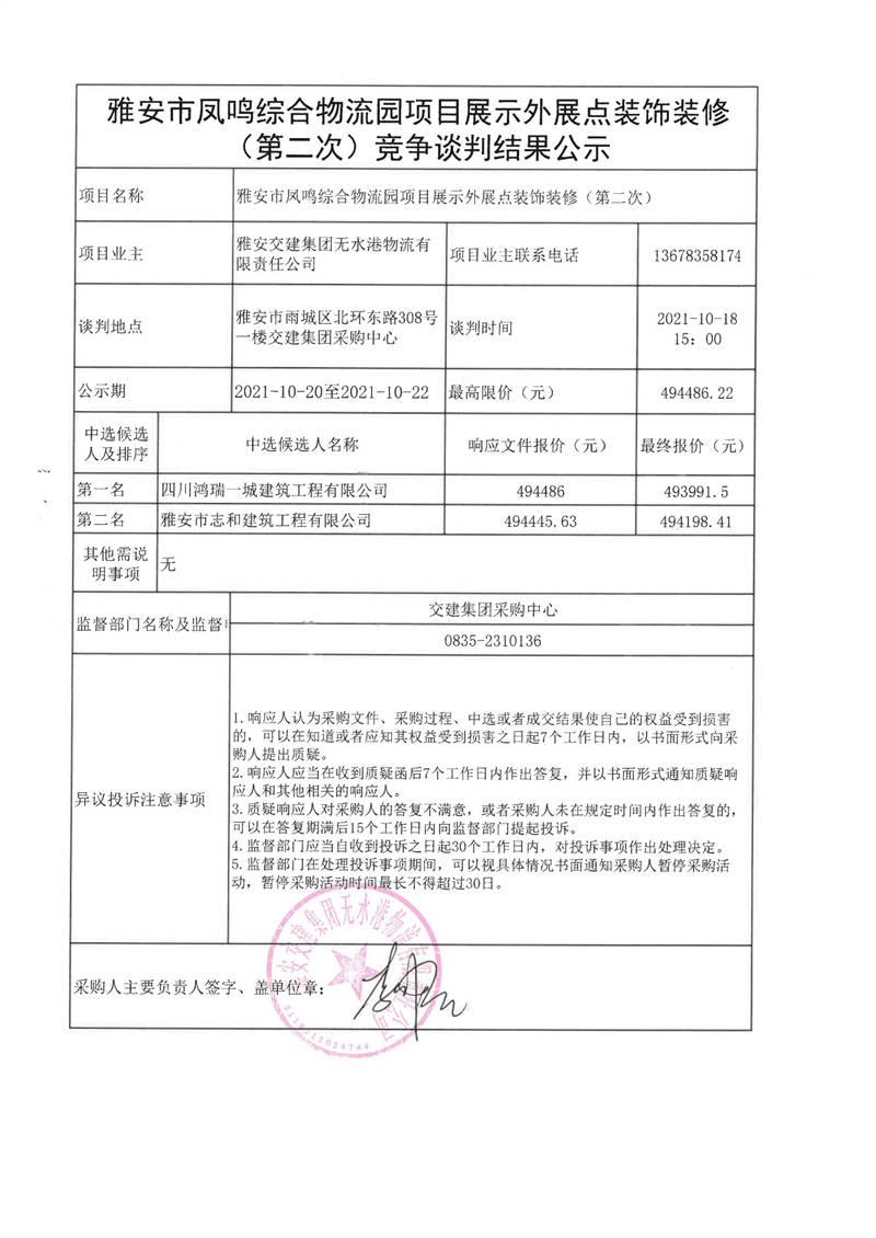 雅安交建集團無水港物流有限責(zé)任公司雅安市鳳鳴綜合物流園項目展示外展點裝飾裝修(第二次)競爭談判結(jié)果公示