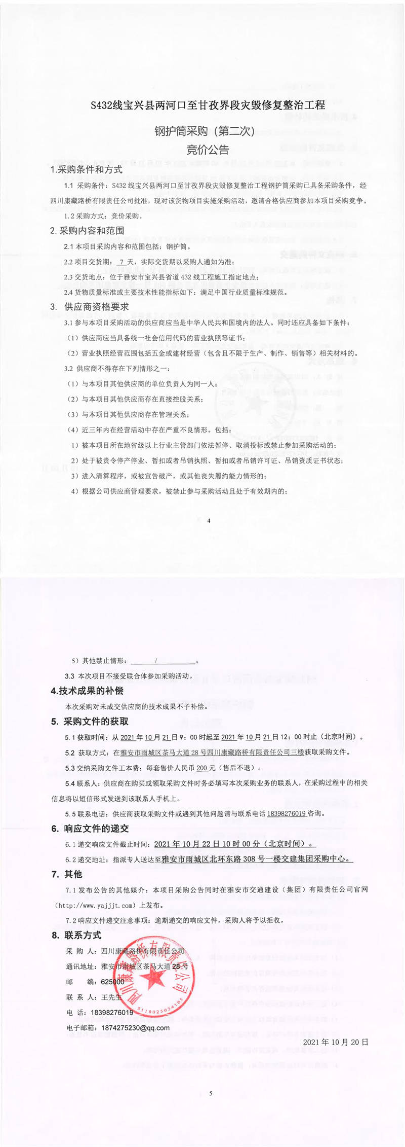 四川康藏路橋有限責(zé)任公司S432線寶興縣兩河口至甘孜界段災(zāi)毀修復(fù)整治工程鋼護(hù)筒采購(第二次)競價公告