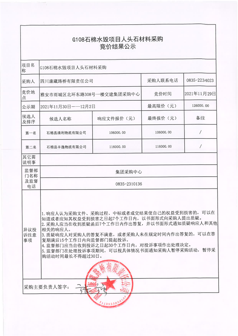 四川康藏路橋有限責任公司G108石棉水毀項目人頭石材料采購競價結(jié)果公示