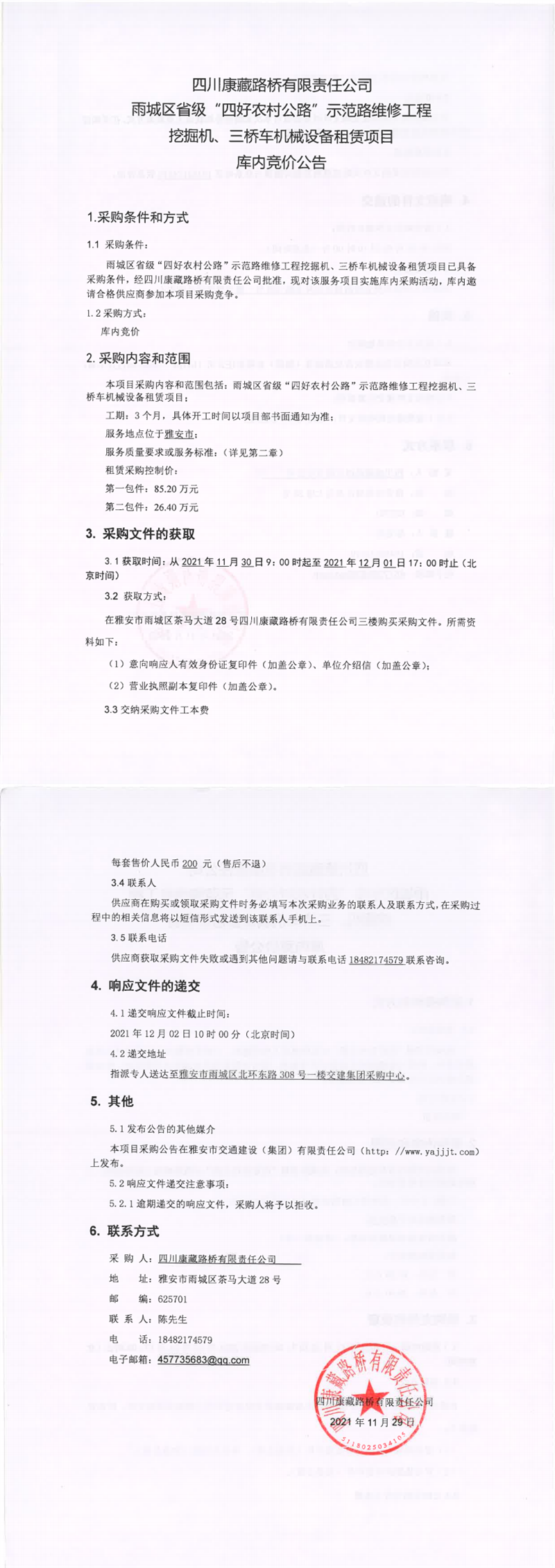 四川康藏路橋有限責任公司雨城區(qū)省級“四好農(nóng)村公路”示范路維修工程挖掘機、三橋車機械設(shè)備租賃項目庫內(nèi)競價公告