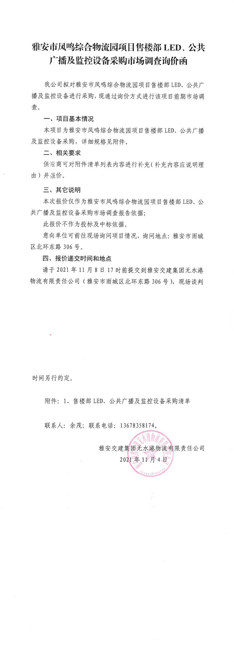 雅安交建集團(tuán)無水港物流有限責(zé)任公司雅安市鳳鳴綜合物流園項(xiàng)目售樓部LED、公共廣播及監(jiān)控設(shè)備采購市場調(diào)查詢價(jià)函