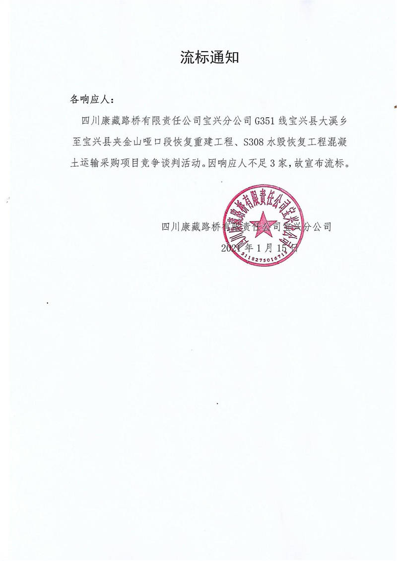四川康藏路橋有限責(zé)任公司寶興分公司G351線寶興縣大溪鄉(xiāng)至寶興縣夾金山啞口段恢復(fù)重建工程、S308水毀恢復(fù)工程混凝土運(yùn)輸采購(gòu)項(xiàng)目流標(biāo)通知