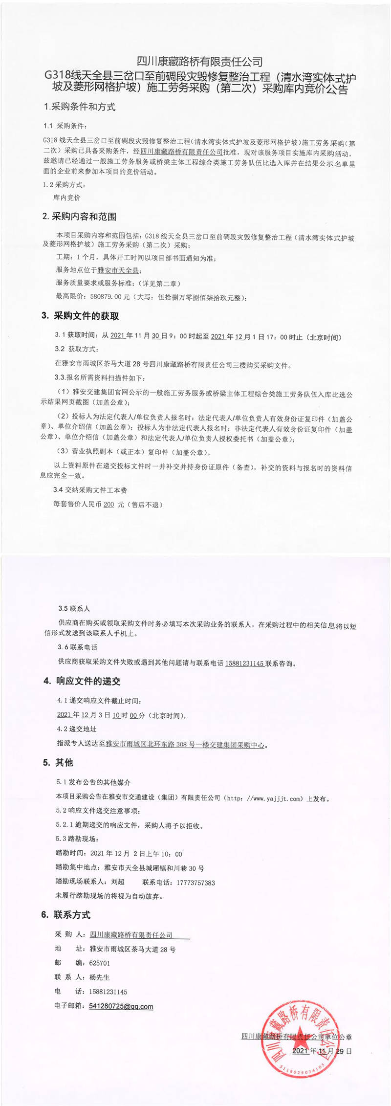 四川康藏路橋有限責(zé)任公司G318線天全縣三岔口至前碉段災(zāi)毀修復(fù)整治工程(清水灣實(shí)體式護(hù)坡及菱形網(wǎng)格護(hù)坡)施工勞務(wù)采購(第二次)采購庫內(nèi)競價(jià)公告