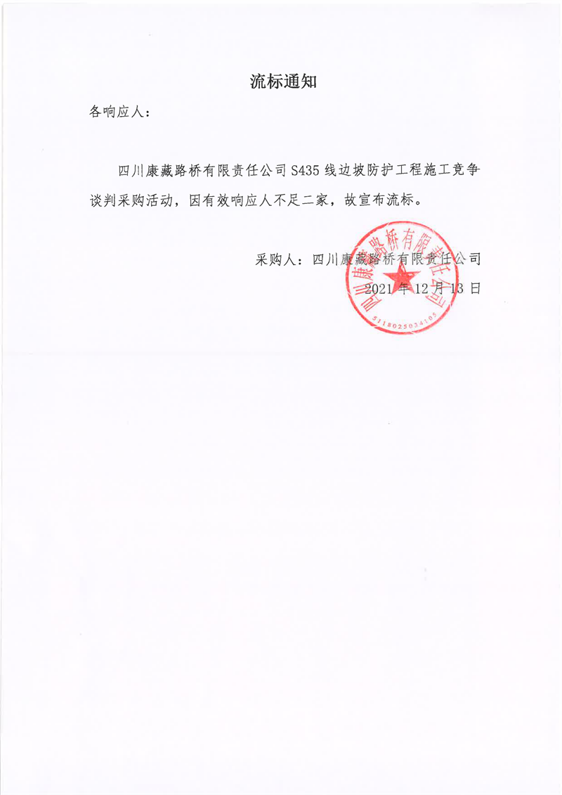 四川康藏路橋有限責任公司S435線邊坡防護工程施工采購流標通知
