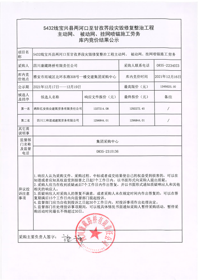 四川康藏路橋有限責任公司S432線寶興縣兩河口至甘孜界段災毀修復整治工程主動網、補動網、掛網噴錨施工勞務庫內競價結果公示