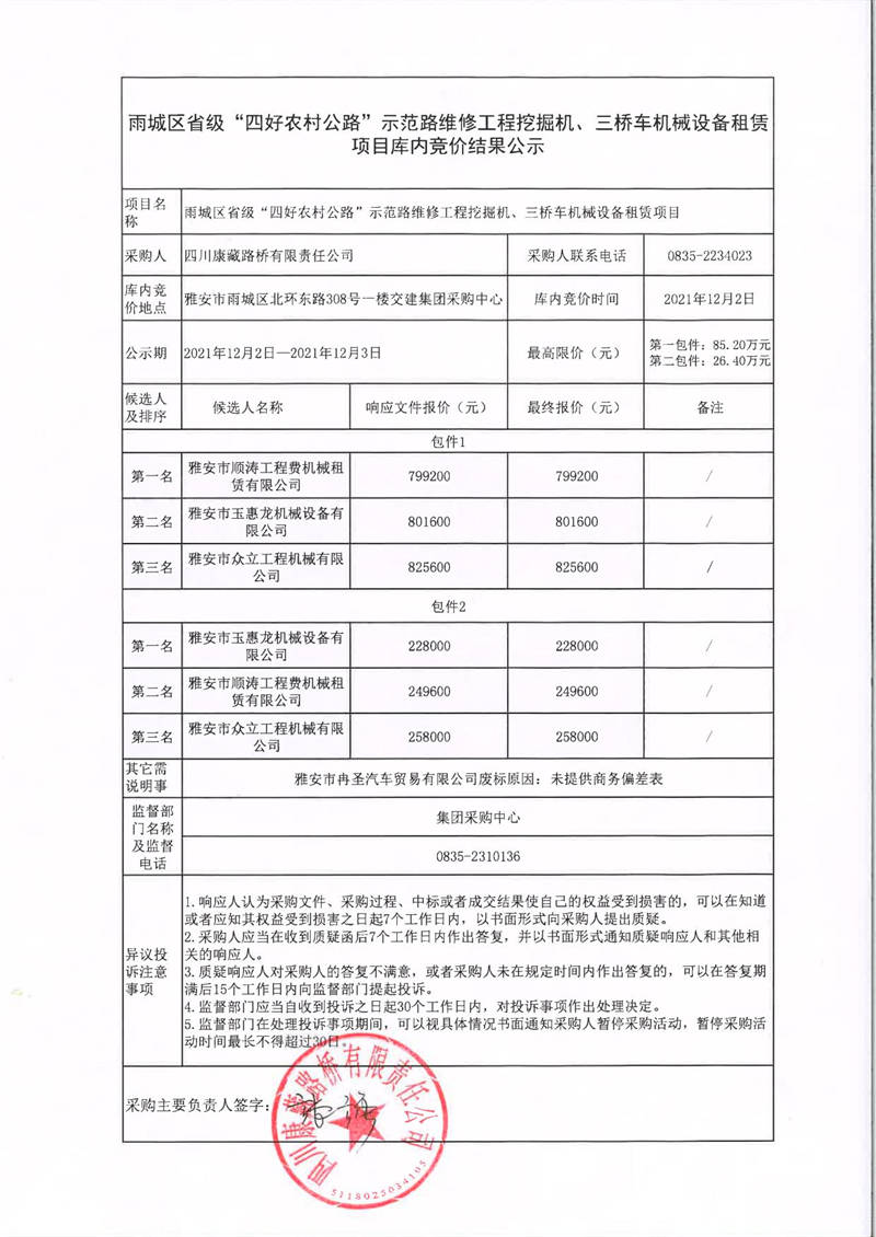 四川康藏路橋有限責(zé)任公司雨城區(qū)省級(jí)“四好農(nóng)村路”示范路維修工程挖掘機(jī)、三橋車機(jī)械設(shè)備租賃項(xiàng)目庫(kù)內(nèi)競(jìng)價(jià)結(jié)果公示